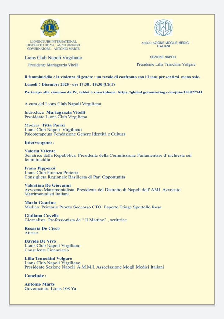 Il Femminicidio e La Violenza di genere: un tavolo di confronto con i Lions per sentirsi meno sole. E’ questo il titolo del Convegno promosso dal Lions Club Napoli Virgiliano presieduto da Maria Grazia Vitelli. Il convegno si svolgerà lunedì 7 dicembre dalle 17.30 alle 19.30 online sulla piattaforma https://global.gotomeeting.com/join/352822741 Per partecipare basta collegarsi al link da pc, telefono o tablet.