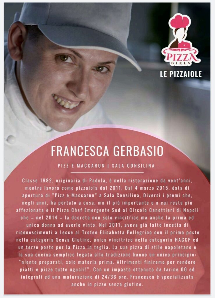 Classe 1982, originaria di Padula e innamorata della sua terra, alla quale è legatissima. Francesca è nella ristorazione da vent’anni, ma lavora come pizzaiola dal 2011. Dal 4 marzo 2015, data di apertura di “Pizz e Maccarun” a Sala Consilina, ha portato a casa diversi premi; ma il più importante, quello al quale resta più affezionata, è il Pizza Chef Emergente Sud al Circolo Canottieri di Napoli, che – nel 2014 – la decreta non solo vincitrice, ma anche la prima e unica donna ad averlo vinto. La sua pizza di stile napoletano e la sua cucina semplice, legata alla tradizione, hanno un unico principio: “niente preparati, solo materia prima. Altrimenti finiremo per rendere piatti e pizze tutte uguali!”.