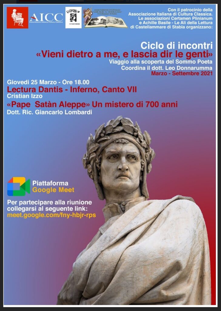 Il progetto parte da due associazioni “Achille Basile-Le Ali della Lettura” e “Certamen Plinianum” che è la Delegazione Stabiese dell’Associazione Italiana di Cultura Classica (AICC) che ha dato il proprio patrocinio ai nostri Percorsi Danteschi. Un ciclo di incontri caratterizzati ognuno da una Lectura Dantis a cura di lettori/lettrici competenti cui fa seguito la relazione di studiosi su tematiche affrontate, anche quando generalmente note, con taglio innovativo e con spunti originali, frutto di accurata ricerca. Un viaggio, insomma, per “esplorare” l’uomo e il poeta Dante, che dopo 700 anni rimane ancora un punto forte di riferimento. Le relazioni saranno dinamiche, interattive con i partecipanti. Sono, poi, previste ad intervalli regolari delle serate speciali, in cui saranno di scena la musica, le arti pittoriche, la recitazione, la sola Lectura Dantis.