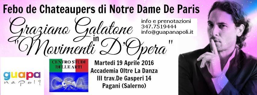 Martedì 19 aprile 2016, giorno precedente l’esordio partenopeo dell’opera popolare “Notre Dame de Paris”, Graziano Galatone, interprete del Capitano Febo de Chateaupers, terrà il suo Workshop di canto, recitazione e movimento scenico all’Accademia Oltre la Danza sita in Pagani, Città in Provincia di Salerno.