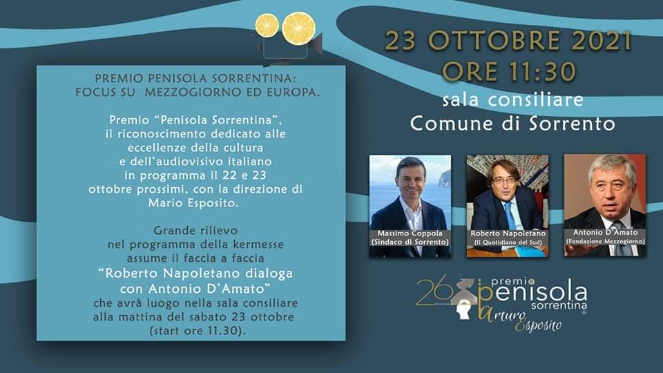 Il 23 ottobre ore 11, nella sala consiliare del Palazzo Municipale del Comune di Sorrento il faccia a faccia “Roberto Napoletano dialoga con Antonio D’Amato”, dedicato ai temi del mezzogiorno e dell’Europa.