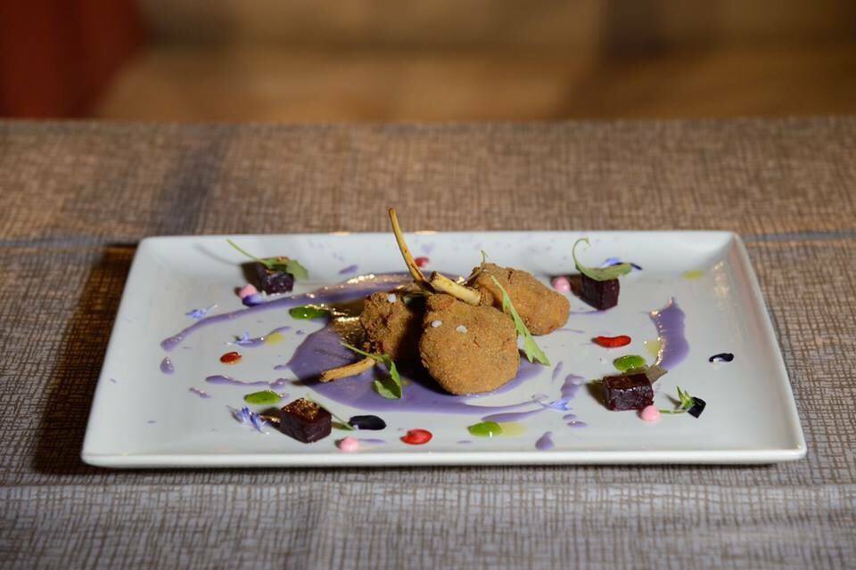 Agnello alla Villeroy , patata viola e rapa rossa.