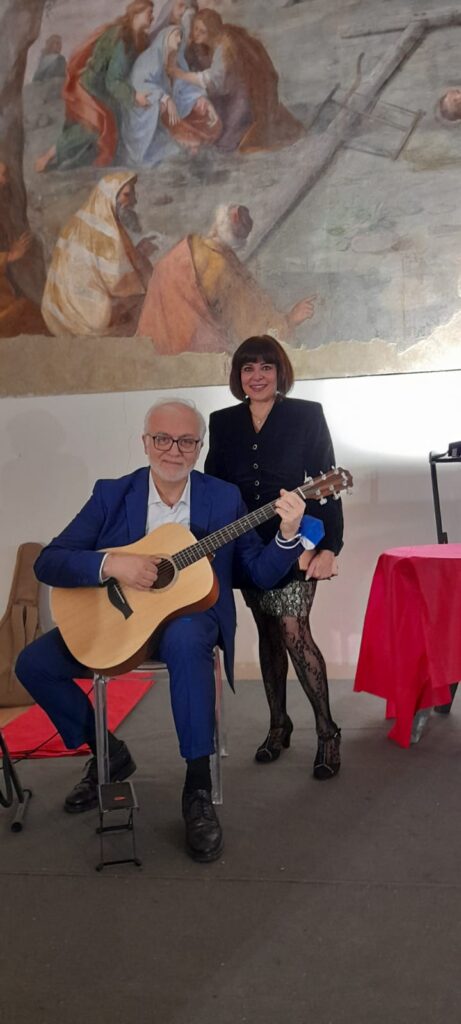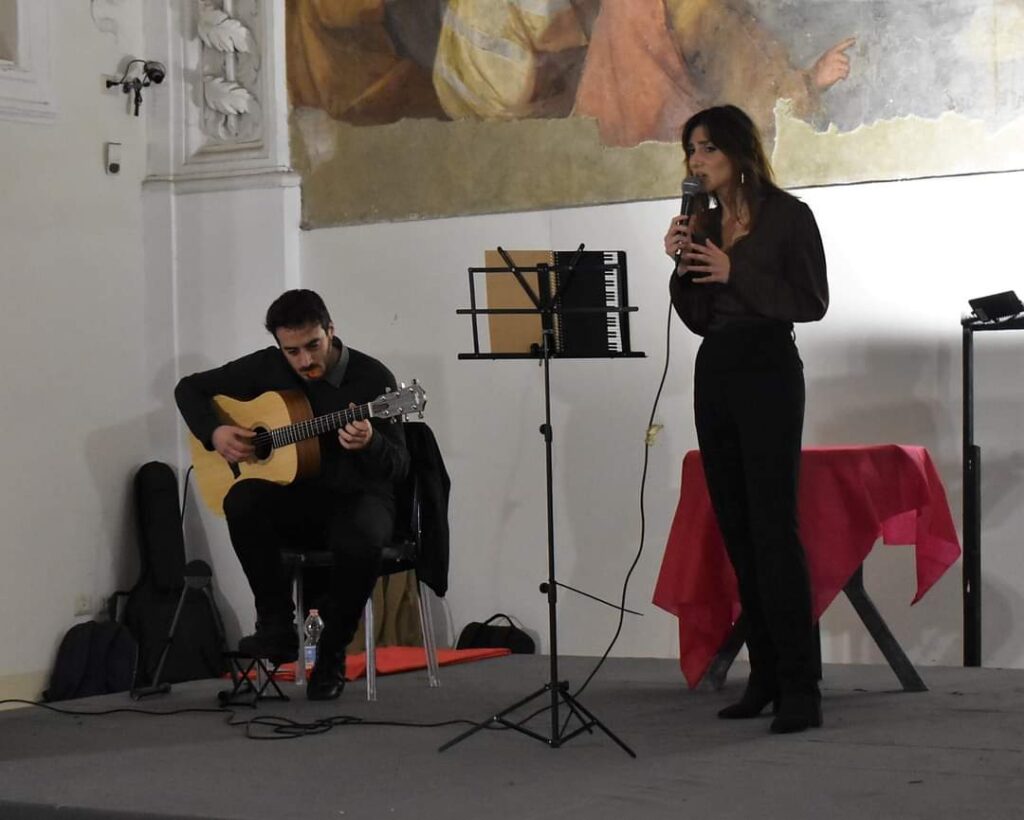 A impreziosire la serata, infatti, DIANA D’ALESSIO, che ha aperto l’elegante serata di Gala nella spettacolare Sala del Capitolo del Mausoleo di San Domenico Maggiore, con Terra mia, del mitico Pino Daniele, e ha proseguito con diversi altri brani del poeta/cantautore partenopeo. Diana, è una cantante professionista emergente; fa parte della band Brand New Swing. Laureata in canto Jazz presso il Conservatorio Martucci con il massimo dei voti e la lode, docente di canto in una scuola di Napoli, esperta di musicoterapia, impartisce pure lezioni private e si esibisce agli eventi. Diana è stata fortemente applaudita dal pubblico in sala. In particolare, quando ha presentato la canzone scritta dalla zia Sonia D’Alessio, ‘NCOPP ‘A SAGLIUTA, accompagnata alla chitarra da Luigi Buonaiuto, autore della musica. Il brano parla della Resilienza che la vita ci costringe a trovare, specie quando il tempo viene a prendersi i nostri gioielli, gli affetti più cari, ma anche della “fede del viaggio”, che è il senso vero della vita. Il brano, nato in italiano, ha subito il processo di trasposizione in napoletano e adattamento musicale. Fa parte del libro DI AMORE&POESIA, uscito lo scorso autunno. Libro “consumato” dice la D’Alessio, perché ne nascono canzoni, presentazioni teatralizzate come quella all’IC Amendola, serate musicali, come quella al Piccolo Teatro, recensioni, analisi testuali nelle scuole, recitazioni e interviste. E molti premi. Ricordiamo, che la D’Alessio già dal 2013 è stata annoverata dal grande Elio Pecora, tra i più meritevoli 50 poeti italiani. Sul cui elenco, Pecora ha scritto una sua antologia, IL CAMMINO DELLA POESIA.
