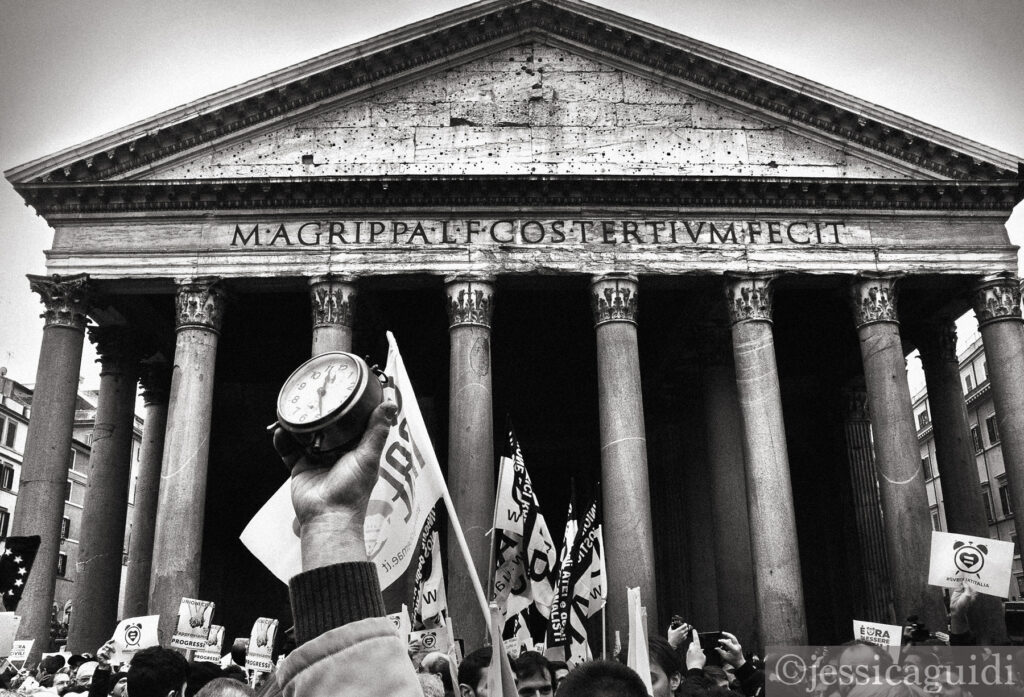 Lo scatto più bello che hai realizzato? Ogni scatto fotografico è come un figlio, è difficile essere obiettivi e scegliere il più bello. Però ci sono foto a cui sono particolarmente legata perché hanno segnato un passaggio. Una di queste è una fotografia realizzata nel 2016 durante una manifestazione per i diritti civili a Roma dal titolo Svegliati Italia. In primo piano, tra i manifestanti, si vede una mano che alza una sveglia e, sullo sfondo, il Pantheon. Da questo scatto decisi di realizzare un reportage – Il Risveglio – che racconta la lotta del movimento LGBT+ italiano durante le manifestazioni per l’approvazione del DDL Cirinnà. Sono legata a questa foto per due motivi. Il primo è che in quella piazza mi sono commossa: ricordo l’espressione fiera dell’uomo che alzava la sveglia, un gay attivista di circa sessant’anni. Intorno c’erano tante famiglie anche eterosessuali scese a manifestare per i diritti degli omosessuali. L’altro motivo è che questa foto mi ha permesso di affacciarmi al mondo dell’arte fotografica fuori dall’Italia: fu esposta al Festival Internazionale di fotografia ad Arles e, da lí, cominciai ad esporre in altre gallerie in Europa.
