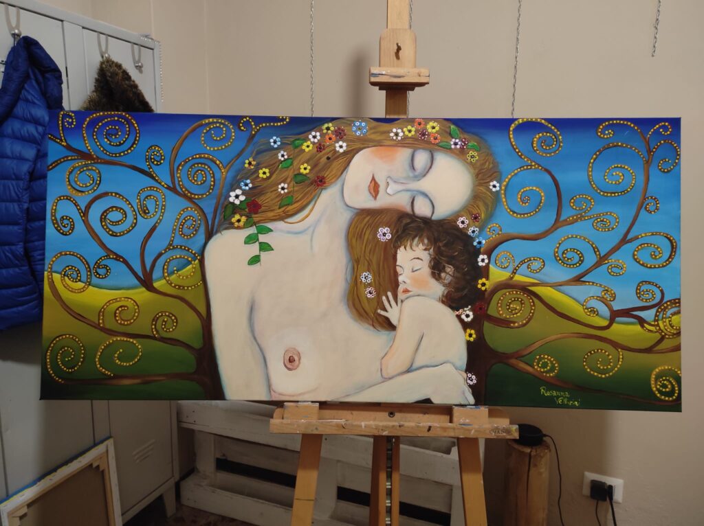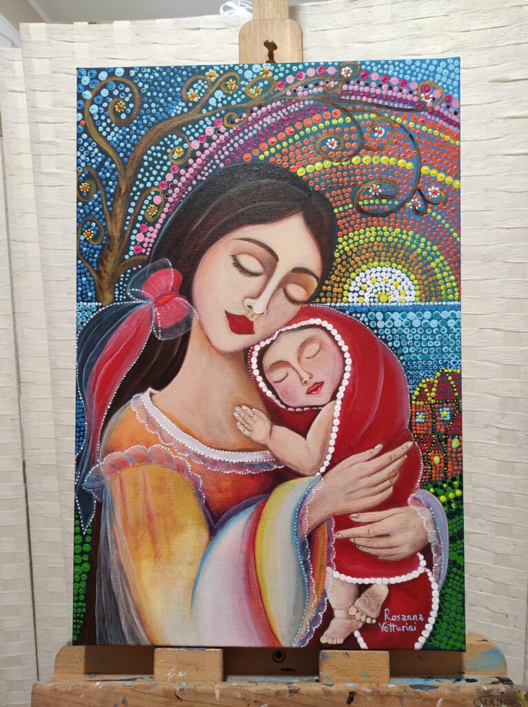 Il quadro che rappresenta “Una mamma che stringe al volto il suo bambino” evidenzia tutta la forte capacità espressiva della pittrice capace di creare un’impalpabile atmosfera luminosa.