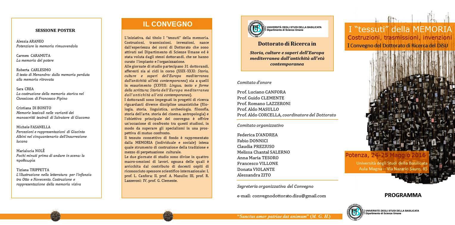 L’iniziativa nasce dall’esperienza dei corsi di Dottorato del DiSU e prevede il coinvolgimento dei dottorandi afferenti ai cicli di Dottorato XXIX, XXX e XXXI (Storia, Culture e Saperi dell’Europa mediterranea dall’antichità all’età contemporanea) e ai due Dottorati del ciclo XXVIII (Storia dell’Europa mediterranea dall’antichità all’età contemporanea e Lingua, testo e forme della scrittura). Nel corso delle giornate di studio parteciperanno 31 dottorandi coinvolti in vari progetti di ricerca, riguardanti diverse discipline di carattere storico e linguistico (storia, filologia, linguistica, archeologia, filosofia, storia dell’arte, storia del cinema e antropologia). Un’occasione di confronto, che consente di superare gli stereotipi culturali, in una prospettiva di mutuo confronto e di ricerca scientifica. Filo conduttore dei vari dibattiti è la Memoria, intesa quale strumento, in continua mobilità e trasformazione, di costruzione della tradizione e mezzo di perpetuazione culturale. Un patrimonio, questo, in perenne riconfigurazione, sia grazie alle più recenti ricerche, sia attraverso le nuove metodologie di approccio scientifico. Tali svariate “costruzioni” e “invenzioni” verranno proposte, in aperto dibattito, dai Dottorandi del Dipartimento di Scienze Umane dell’Università della Basilicata.