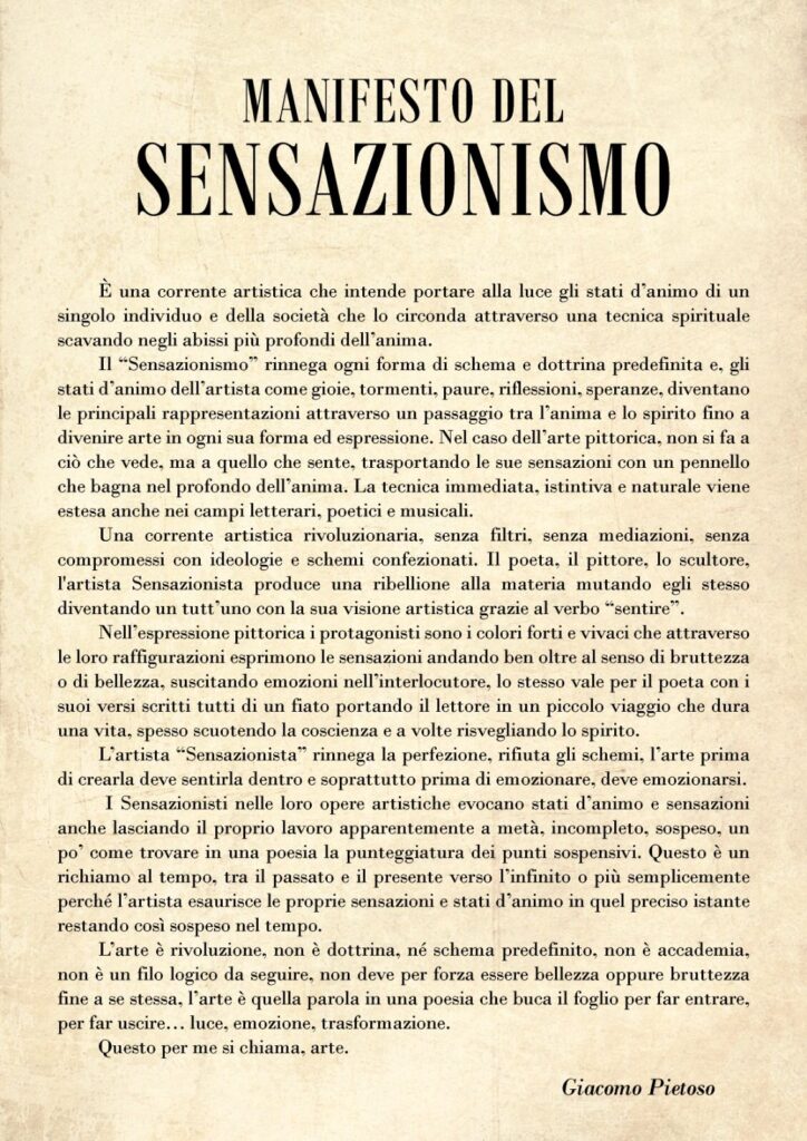 Il SENSAZIONISMO pone al centro della sua corrente un’arte originale, nutrita da un artista capace di emozionarsi, prima ancora di emozionare. Gioie, dolori, sofferenze, speranze, amore, altissima serenità o profondissima irrequietudine, è questo ciò che fa muovere lo spirito Sensazionista. I sensi sono alla base della sua manifestazione. Attraverso essi l’artista muta e trasforma le percezioni in arte pura. Lo sa bene Giacomo Pietoso, che da pittore, scultore, poeta, proprio grazie ai sensi, è riuscito ad andare ben oltre il visibile, spingendosi con le sue opere verso l’ignoto, l’infinito, il mistero.