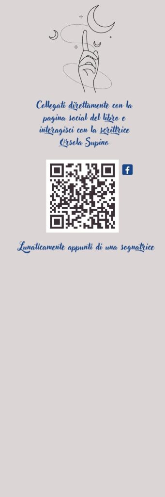 Benvenuto/a, se ti sei interessato a questo libro, sei pronto/a ad affrontare insieme a me un viaggio carico di emozioni. Mi presento: mi chiamo Orsola Supino e questo è il mio secondo libro di poesie. Ma non è un semplice libro. È una sorta di “Booknotes”: potrai letteralmente annotare i pensieri, le idee e le sensazioni che la lettura ti suscita. Trasformare tutto, a tua volta, in immagini o in parole. Stimolare la creatività e allenare i sentimenti. Armati di una penna, di una matita, di colori, oppure di foto o adesivi e rendi le pagine bianche accanto alle mie poesie le tue pagine. Il mio libro sarà davvero il tuo libro. Un libro unico. Perché “LunaticaMente, appunti di una sognatrice”? Se hai letto “Estemporanee di emozioni”, la mia prima raccolta di poesie, allora giá conosci l’importanza che hanno le emozioni per me. Tra il primo e secondo lockdown (2020-2021) ho provato, anch’io come tante persone nel mondo, un grande senso di sconforto. Ho cercato di farmi coraggio e di trovare sempre la giusta dose di ottimismo. Lo faccio da clown di corsia, da artista, da mamma e da donna. Il quel periodo di chiusura totale, l’unico collegamento con gli altri, la luce che illumina tutto e tutti nelle notti cupe e solitarie, era lei: la Luna. Bastava alzare lo sguardo ed era sempre lì; a volte nascosta, altre volte grande e bianca, splendeva. Un filo che ci univa un po’ tutti. A distanza. Ecco perché ho voluto ispirarmi a lei. Ai sogni che andavano oltre quella barriera di paura. In cerca di pace e di speranza. Sognatrice lo sono sempre stata e sempre lo sarò. Ho collezionato pensieri, parole, emozioni ed immagini che prendono adesso nuovo slancio e nuova vita. Vita condizionata, inconsapevolmente e consapevolmente, dallo sguardo della luna. Per questo “lunatica”. Cambio umore facilmente: euforica, malinconica, dubbiosa… la poesia, l’arte, la musica… il mio mondo è sentimento e dinamicità. Benvenuti nel mio mondo.