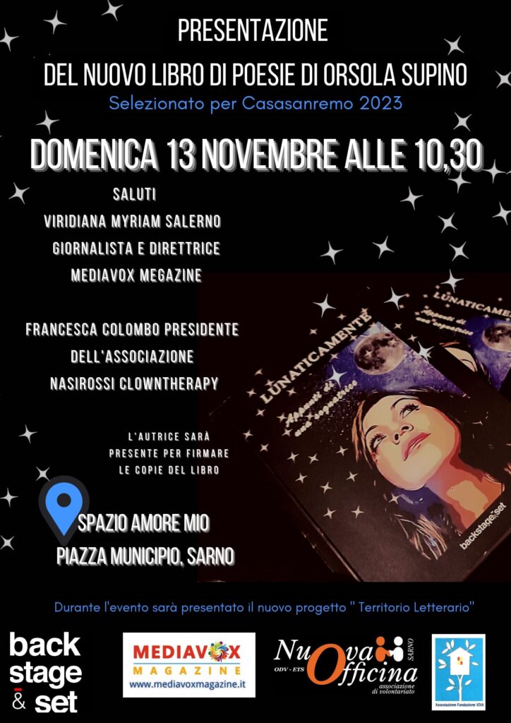 Orsola è un’artista, una poetessa e una volontaria dei “Nasi Rossi Clown Therapy” che ha tanto da raccontare. Non perdere la presentazione a Sarno (SA), presso la bellissima location SPAZIO AMORE MIO in Piazza Municipio. Ti aspettiamo domenica 13 novembre alle ore 10.30 per dialogare con l’autrice e per dare il via al nuovo e corale progetto “Territorio letterario“, ideato da Nuova Officina Onlus e da Associazione Fondazione Viva.