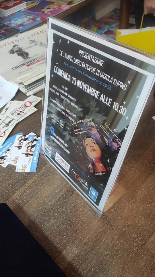 Grande successo per la prima mattinata all’insegna della lettura e dell’incontro. Lo splendido “Spazio Amore mio” si è trasformato in un accogliente salotto letterario in occasione della presentazione di “Lunaticamente“, la raccolta di poesia interattiva di Orsola Supino (Edizioni Backstage&Set), selezionata per La Vetrina di Casa Sanremo Writers 2023.