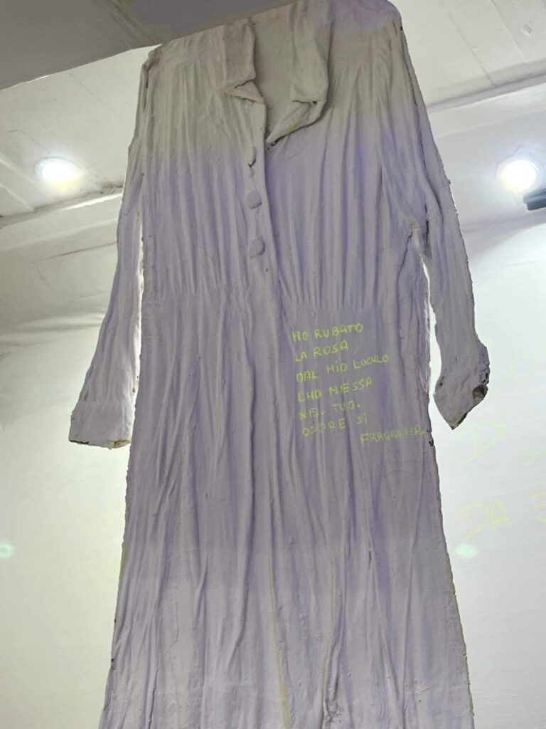 Una mostra ‘tridimensionale’ dove lui pittore e regista ricrea la stanza dove la poetessa statunitense, scegliendo la solitudine, visse i suoi anni rinchiusa. Dal soffitto pendono i suoi abiti bianchi, che sono calchi di vestiti. Bianchi perché era quello il suo colore e bianchi anche per testimoniarne la verginità. Sugli abiti, con un gioco di luci, scorrono i suoi versi.