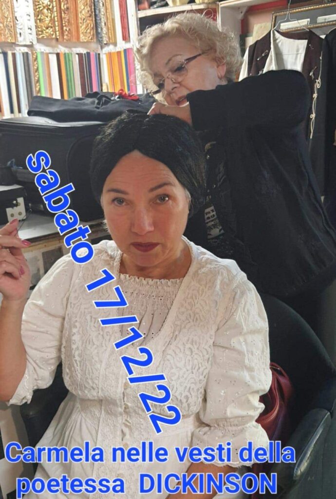 L’attrice Carmela che interpreta la poetessa li recita con ardore.