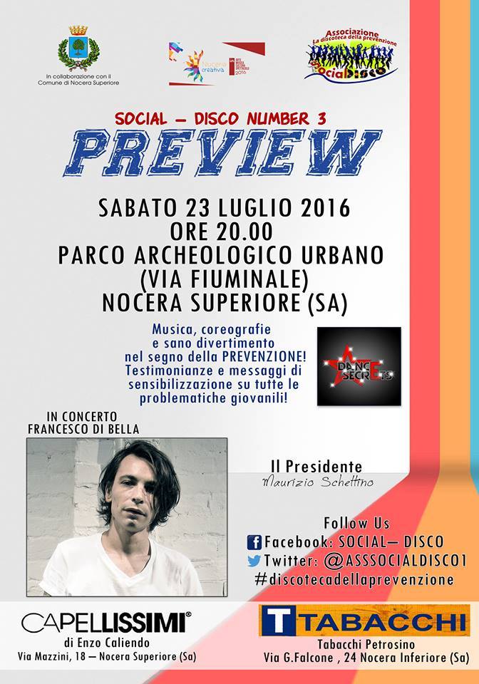 L’Associazione di promozione sociale “Social-Disco”, in collaborazione con il Comune di Nocera Superiore (SA), organizza l’anteprima della III Edizione della “Social-Disco: la discoteca della prevenzione”, in programma per sabato 23 Luglio 2016, dalle ore 20:00, all’interno del Parco Archeologico Urbano.