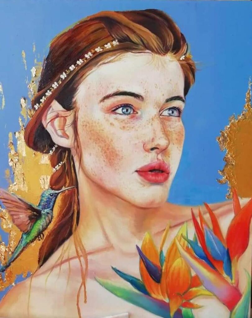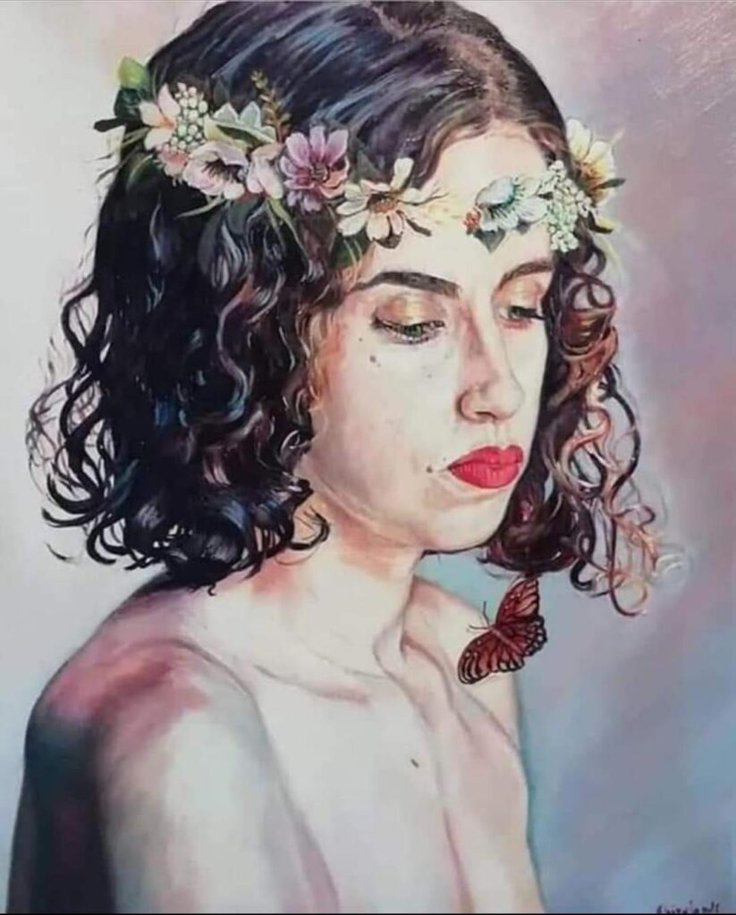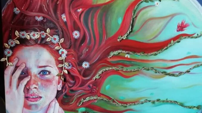 Mi parli della sua arte… La mia arte è sicuramente in fase di sviluppo. Posso dire con certezza che rispetto ai primordi, c’è stata una crescita ed un evoluzione dettate dalla continua ricerca e perseveranza. Inizialmente dipingevo prevalentemente nature morte e paesaggi, in una maniera alquanto meticolosa e veritiera. La mia pittura era piatta, non lasciavo intravedere nessuna pennellata, volevo che risultasse “liscia”. Con il tempo poi ho capito che non era ciò che volevo. Osservavo i dipinti del mio insegnante e volevo che anche i miei “vivessero”. Da allora mi sono impegnata al fine di ottenere una resa pittorica fresca, pastosa, densa, dove si intravedesse la pennellata, perché questo non è un difetto. Ho imparato ad accettare che la perfezione non esiste e che sopratutto non la desidero per me. L’arte è bella in quanto tale, con le sue imperfezioni, è emozione. Ho iniziato a giocare con i colori, non necessariamente il tronco di un albero deve essere marrone, ci sono infinite sfumature, le mie, che sono diverse da quelle di qualcun altro. Ho iniziato ad osare, anche se molti non lo direbbero. Per molti la mia pittura è accademica, classica, seppur così fosse non credo ci sia un problema. Ognuno ha il suo stile, questo è il mio. Per anni l ho ricercato, in modo anche ossessivo, era una fonte di sofferenza, ma credo che sono sulla giusta strada. Negli ultimi anni mi sono dedicata alla figura umana, tema che mi ha sempre spaventata. Raffigurare un volto non è facile, ancor di più renderne l espressione. Eppure ho trovato una mia dimensione in essa. Il Soggetto dei miei ultimi lavori è sempre un volto femminile, che poi vado ad inserire in un contesto quasi fiabesco. Ed ecco che nasce il ciclo delle opere Girl’s in stile, dove lo sfondo diventa una composizione magica che rende il dipinto unico nel suo genere. Questo lo possiamo vedere nelle opere intitolate: La regina dei topi, Chameleon, Fasi lunari, l’uccello del paradiso, Le geometrie del cielo, red belle. Per i soggetti mi ispiro a persone vere, conoscenti o foto prese dal web che poi rielaboro secondo i miei gusti. Ho sempre bisogno di avere un riferimento, ma l’essermi lasciata andare sull’aspetto compositivo è già per me una grande vittoria. Faccio mia una citazione fatta da un mio insegnante il primo anno del liceo: “Non si può disegnare senza un punto di riferimento, bisogna sempre osservare qualcosa e lasciarsi ispirare da essa.” Per quanto riguarda invece la mia tavolozza cromatica posso affermare che varia dai toni del blu cobalto, ai toni del rosso arancio, in base al mio stato d’animo. Lo possiamo notare in particolare nelle opere Geometrie del cielo o la Primavera dove prevalgono i toni del lilla, indaco. In Chameleon, e La regina di topi invece, prevalgono i toni del rosso-arancio.