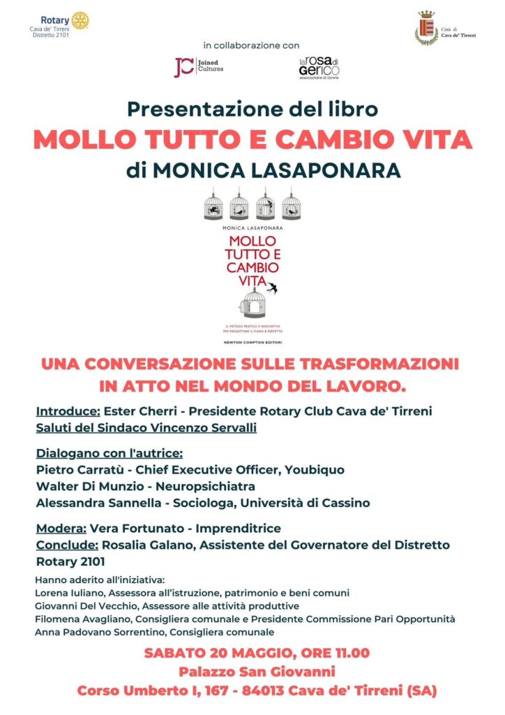 L’evento, moderato da Vera Fortunato e organizzato dal Rotary di Cava de’ Tirreni Distretto 2101 in collaborazione con le Associazioni Joined Cultures , la Rosa di Gerico ed i patrocinio del Comune, vedrà aprire la conversazione sulle trasformazioni del mondo del lavoro con la Presidente del Rotary club Dott.ssa Ester Cherri e i saluti istituzionali del sindaco della città metelliana Dott Vincenzo Servalli. Dialogheranno con l’autrice Pietro Carratù Chief Executive Officer di Youbiquo, Walter di Munzio Neuropsichiatra e la sociologa dell’Università di Cassino Alessandra Sannella. Le conclusioni dei lavori sono affidate all’Assistente del Distretto Rotary 2101Rosalia Galano.
