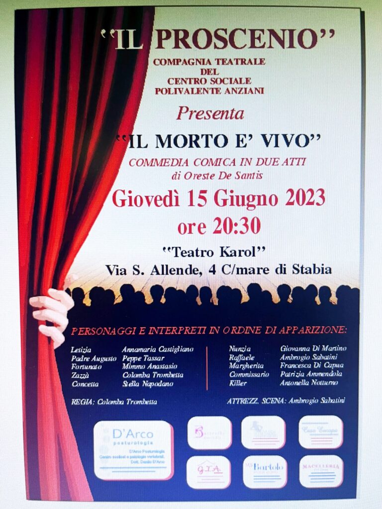 Giovedì 15 giugno 2023, ore 20.30, la Compagnia Teatrale del Centro Sociale Polivalente Anziani, presso il teatro Karol a Castellammare di Stabia (NA), presenterà la commedia-comica “Il morto è vivo” di Oreste De Santis con la regia di Colomba Trombetta.