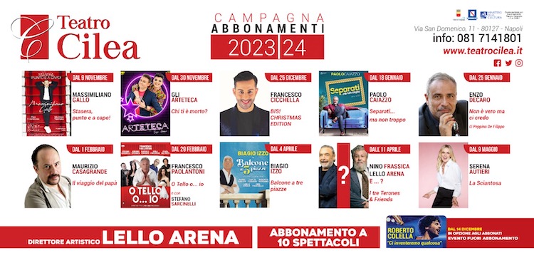In programma troviamo l’attore Massimiliano Gallo che inaugurerà la stagione il 9 novembre con lo spettacolo “Stasera, punto e a capo” in scena con lui l’attrice Shalana Santana e un ensemble musicale diretta dal M° Mimmo Napoletano.Dal 30 novembre il duo Arteteca, con Enzo Iuppariello e Monica Lima, torna in scena con la cab-commedia “Chi ti è morto?” scritta da Nando Mormone, Monica Silvia Lima, Enzo Iuppariello. Dal 25 dicembre ritroviamo in scena Francesco Cicchella che con lo spettacolo “Bis! Christmas Edition” si gioca tutte le sue carte in un one man show esilarante, nel quale ritroviamo i suoi cavalli di battaglia. Grande ritorno dal 18 gennaio per Paolo Caiazzo con lo spettacolo “Separati ma non troppo” mentre per la prima volta al Cilea arriva dal 25 gennaioEnzo Decaro in “Non è vero ma ci credo”, commedia di Peppino De Filippo. “Il viaggio del papà” di Maurizio Casagrande invece andrà in scena dal 1 febbraio con una commedia toccante che racconta il rapporto tra padre e figlio. Dal 29 febbraio con uno spettacolo scritto da Stefano Sarcinelli in scena Francesco Paolantoni in “O… Tello O… Io” con Stefano Sarcinelli, Felicia del Prete, Raffaele Esposito, Arduino Speranza per una serata filo…drammatica è uno spettacolo ispirato alla commedia dell’arte. “Balcone a tre piazze” invece è lo spettacolo che vede protagonista Biagio Izzo. Scritto di Mirko Setaro e Francesco Velonà, con la regia di Pino L’Abbate, è una divertentissima commedia che andrà in scena dal 4 aprile.“I Tre Terones & Friends” invece è lo spettacolo inedito con Lello Arena e Nino Frassica che prevede un terzo attore comico che verrà svelato a sorpresa. A chiudere la stagione teatrale del Cilea ci sarà Serena Autieri. Dal 9 maggio l’attrice e cantante napoletana sarà in scena con la regia di Gino Landi in “La Sciantosa” spettacolo scritto da Vincenzo Incenzo dove rilegge Elvira Donnarumma, detta “‘a capinera napulitana”, regina indiscussa dei cafè chantant d’inizio 900, anticonformista e antidiva, amata da Eleonora Duse e Matilde Serao.