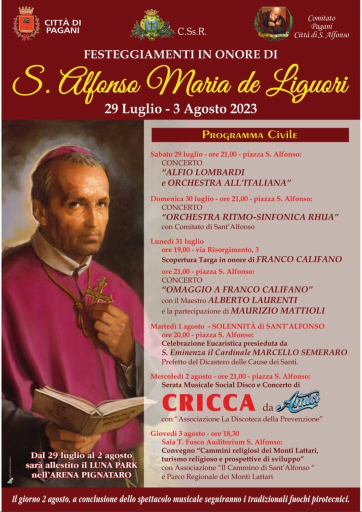 Anche quest’anno abbiamo lavorare di concerto con il Comitato festa di Sant’Alfonso e i padri Redentoristi perché la festa rendesse al meglio onore al grande Sant’Alfonso, combinando grande musica, divertimenti ma anche temi di sensibilizzazione. Abbiamo messo in campo tipologie di eventi diverse, che coinvolgeranno l’intera popolazione per 6 giorni, con particolare attenzione ai giovanissimi della città. Siamo infatti felici di accogliere a Pagani il prossimo 2 agosto il giovane cantante Cricca di Amici, molto atteso non solo dai giovani paganesi, ma anche dai fans dei comuni limitrofi. Questi festeggiamenti saranno poi l’occasione per omaggiare ancora una volta il grande Franco Califano e incidere per sempre il suo nome tra le strade di Pagani, la città che ha tanto amato, che non lo dimenticherà mai . – ha sottolineato l’assessore Oliva.