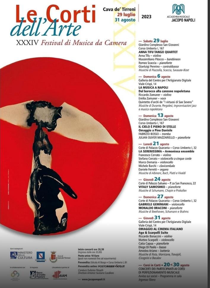 Negli anni ha continuato a studiare e ad evolversi presentandosi nei teatri più prestigiosi al mondo piazzandosi in concorsi internazionali tra cui il “George Enescu” di Bucharest nel 2007 a livelli altissimi.La serata di debutto della rassegna delle Corti dell’Arte ieri sera davvero col botto,conterà altri attesissimi appuntamenti con nomi importanti:Riccardo Zamuner (violino) ed Emilia Zamuner (voce) con il Quintetto d’archi de “I virtuosi di San Severo” in un viaggio nella napoletanita’ tra le epoche dal barocco alla canzone d’autore (6 agosto), poi sarà la volta del trombettista Fabrizio Bosso e il pianista Julian Oliver Mazzariello in un particolarissimo omaggio a Pino Daniele (13 agosto), l’ensemble di musica antica Armoniosa (21 agosto) seguirà a ruota, cosi come il pianista ucraino Vitaly Samoshko (24 agosto) ed il violoncellista Gabriele Geminiani con il pianista Monaldo Braconi (27 agosto), il Felix Piano Trio con il bassista Diego Di Paolo e il batterista Amedeo Ariano in un omaggio al cinema italiano. Davvero un’offerta ottima, per tutti i gusti! Basta solo segnarsi in agenda le date per non perdersi queste serate estive incredibili chiaro della luna cavese in compagnia di ottima musica.
