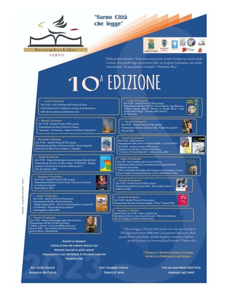 Nella mattinata del 04 settembre 2023, nell’Aula Consiliare del Municipio di Sarno, si è svolta la Conferenza Stampa di presentazione della X Edizione della Rassegna “SETTEMBRE LIBRI”, organizzata dall’Amministrazione Comunale per il corrente mese di settembre.