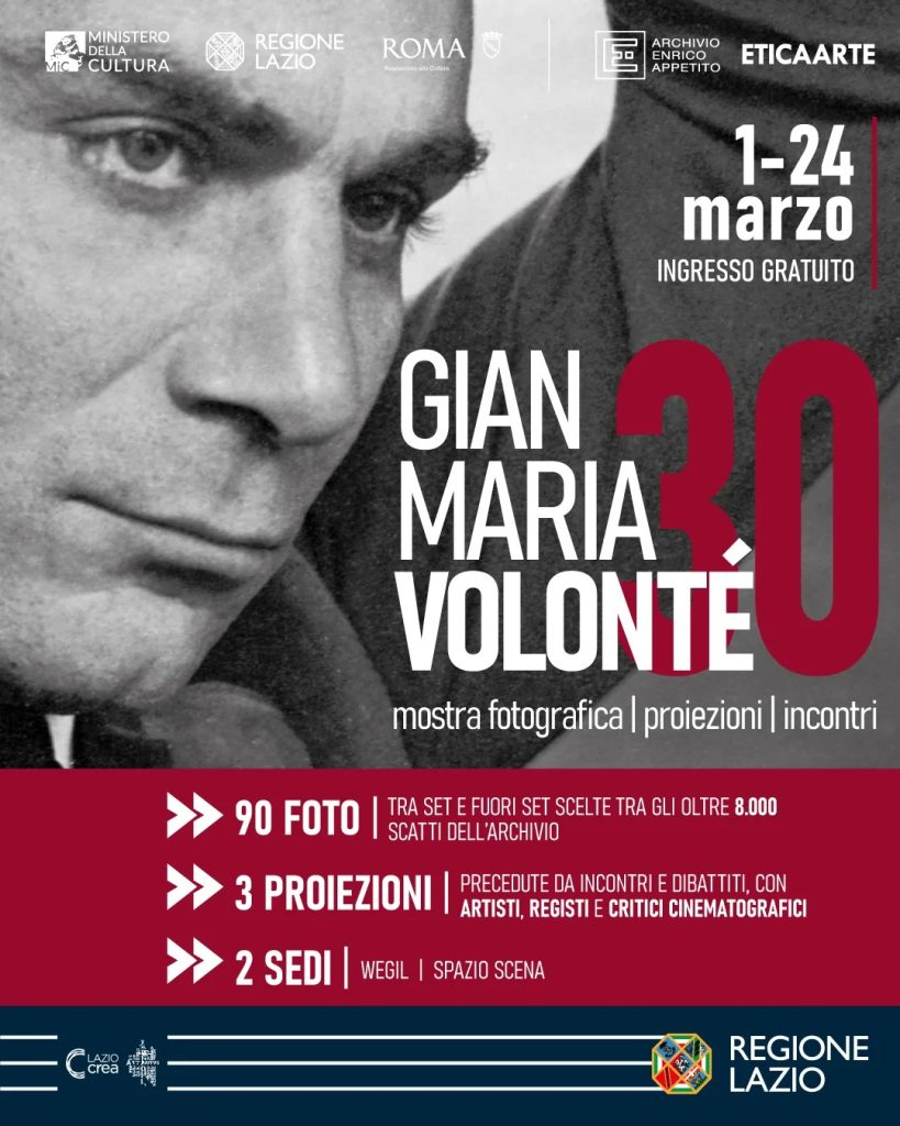 Quest’anno ricorre il trentennale della scomparsa di uno degli interpreti più importanti e poliedrici del cinema italiano: Gian Maria Volonté. L’Archivio Storico di Cinema Enrico Appetito celebrerà l’artista con la mostra evento Gian Maria Volonté 30 La mostra: dal 1 al 24 marzo 2024 tutti i giorni dalle 10:00 alle 19:00, a ingresso gratuito, negli spazi del WEGIL, hub culturale della Regione Lazio gestito dalla società regionale LAZIOcrea a Trastevere, a Largo Ascianghi 5. Tra i film presenti in Archivio sono stati selezionati tre dei film più rappresentativi tra quelli interpretati da Volontè: Indagine su un cittadino al di sopra di ogni sospetto, Sacco e Vanzetti e Per un pugno di dollari. La mostra propone novanta foto, divise tra set e fuori set, scelte tra le oltre 8.000 foto presenti in archivio dei tre film, saranno esposte al piano terra dell’edificio razionalista disegnato da Luigi Moretti. Il cinema: Nel pomeriggio ore 18:30, sempre con ingresso gratuito, gli appuntamenti proseguiranno con la proiezione dei tre film preceduti da incontri e dibattiti, realizzati in collaborazione con la rivista LEFT, con artisti, registi e critici cinematografici moderati da Giusi De Santis e Francesco Della Calce. SPAZIO SCENA lo spazio polivalente e polifuzionale della Regione Lazio gestito da LAZIOcrea, in via Degli Orti d’Alibert, a Trastevere, ospiterà le proiezioni dei tre film con il seguente programma: