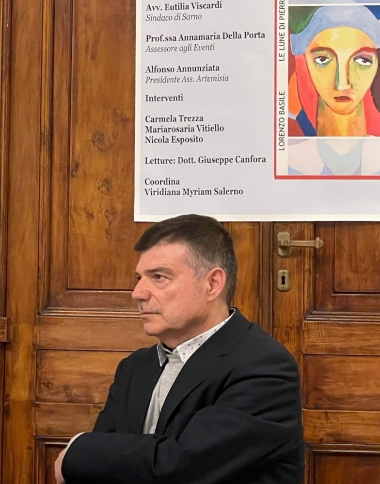 E’ stata poi la volta della prof.ssa Mariarosaria Vitiello, la quale ha fatto un’osservazione, attingendo alla sua esperienza diretta con Lorenzo Basile, in una mostra a Cava dove ha individuato qualità che risuonavano con la sua stessa poesia: profondità, complessità e versatilità. Ha poi riflettuto insieme al pubblico sull’importanza di leggere poesie per restare ancorati e immergersi nel momento presente, infondendo nel mondo energia e vibrazioni positive. Ha concluso con una citazione di Neruda secondo il quale “la poesia è un atto di pace”.