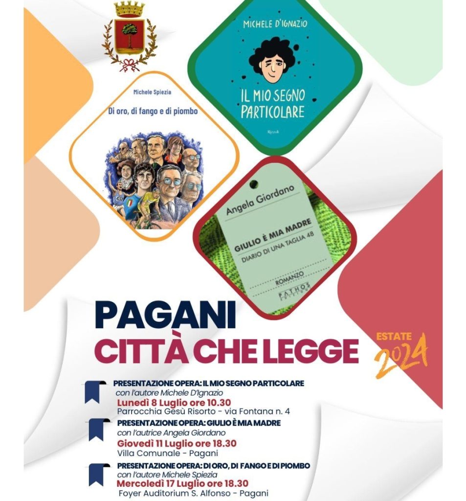 Ritorna la rassegna letteraria “Pagani città che legge” con una serie di appuntamenti imperdibili per gli amanti della lettura. Da lunedì 8 luglio a mercoledì 17 luglio, la città di Pagani (SA) ospiterà tre incontri con autori del sud Italia, rinomati per la loro capacità di stimolare profonde riflessioni attraverso la scrittura.