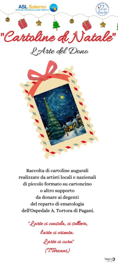 Cartoline di Natale – L’arte del dono | Una iniziativa di condivisione artistica ideata dall’artista Lorenzo Basile assieme alla coordinatrice del reparto di ematologia dell’Ospedale A. Tortora di Pagani dott. ssa Carmela Trezza, con la supervisione del primario prof. Catello Califano e con la collaborazione dell’Associazione Nasi Rossi Clownw Therapy presieduta dalla dott. ssa Francesca Colombo