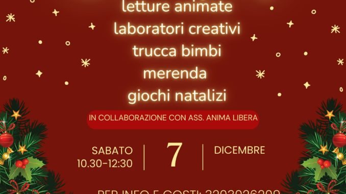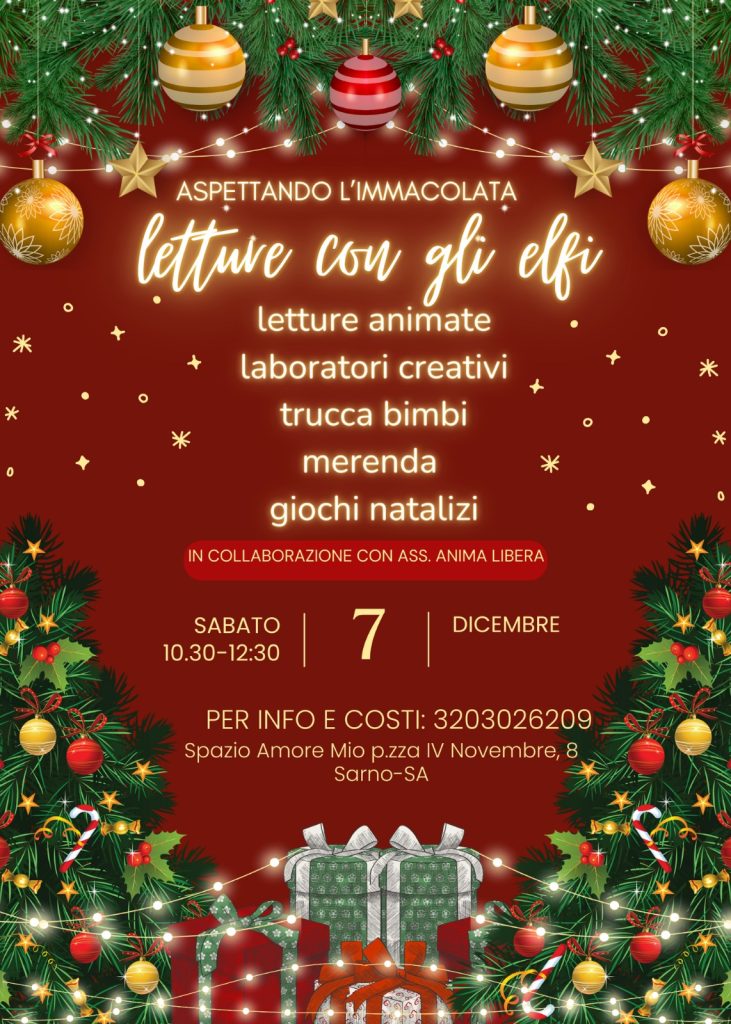 Sabato 7 dicembre ci sarà l’evento Letture con gli elfi, ovvero letture animate, trucca bimbi, laboratori creativi ed altro nella Libreria Spazio Amore mio in collaborazione con l’Associazione Anima libera.