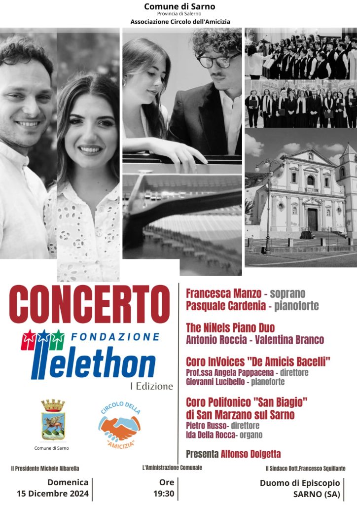 Domenica 15 dicembre 2024 alle ore 19:30, nel meraviglioso Duomo di Episcopio della città di Sarno (SA), il Circolo dell’Amicizia, con il patrocinio del Comune, organizzerà un concerto a sostegno di Telethon per aiutare la ricerca sulle malattie genetiche rare.