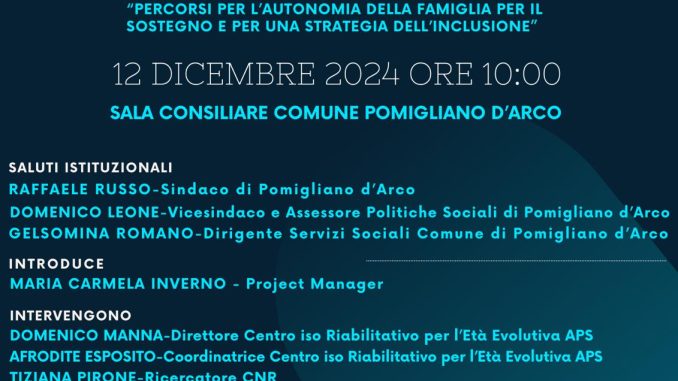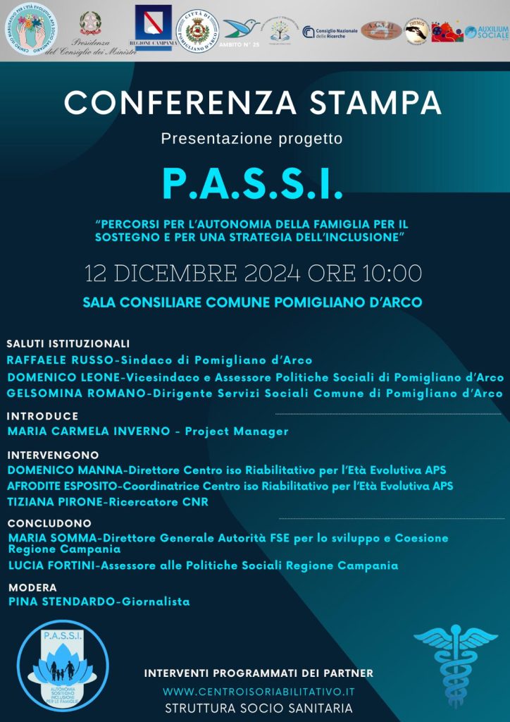 Pomigliano d’Arco, 9 Dicembre 2024 – Il Centro Iso Riabilititativo APS, Struttura Socio Sanitaria di Pomigliano d’Arco presenta ‘PASSI’, Percorsi per l’Autonomia della famiglia per il Sostegno e per una Strategia dell’Inclusione , destinato ai genitori di bambini con sindrome da spettro autistico, in età evolutiva.Promosso dal Dott. Domenico Manna, direttore del Centro di terapia multidisciplinare per ogni forma di disabilità, in collaborazione con la Responsabile coordinatrice Dott.ssa Afrodite Esposito, il progetto formativo ed informativo, di cui il Dott. Manna è anche ideatore e responsabile scientifico, mira a coinvolgere le famiglie impegnate nel caregiving parental, offrendo loro autonomia e sostegno psicologico nella mediazione terapeutica dell’autismo.Con il supporto istituzionale della Città di Pomigliano D’Arco, dell’ambito comunale n. 25, del Consiglio Nazionale delle Ricerche e dell’Asl Napoli3 Sud, il progetto finanziato dalla Presidenza del Consiglio dei Ministri, oltre che dalla Regione Campania, sarà ufficialmente descritto nel corso della conferenza stampa organizzata il 12 dicembre, alle ore 10.00, nella sala consiliare del Comune di Pomigliano D’ Arco.Pensato per contrastare scoramento ed isolamento delle famiglie che si trovano a convivere con le criticità dell’autismo, ‘PASSI’ aiuterà a vedere nell’autismo una divers-abilità che può essere affrontata con nuove strategie.Partner del percorso saranno A.G.V.H – Associazione Genitori e Volontari per la tutela dei Disabili; THYMOS – Organizzazione di volontariato; Auxilium Sociale A.P.S; Kirghisia A.P.S.Il Centro socio sanitario situato in via Giuseppe Luraghi a Pomigliano D’Arco (Interno Consorzio Il Sole), articolerà la formazione nei seguenti moduli previsti dal progetto:- Parent training: percorso per l’insegnamento dei metodi educativi evidence based (approccio fondato su incontri di gruppo, migliori evidenze disponibili, good e best practice);- Sportello psicologico per le famiglie;- Percorso di teatro sociale per limitare la crisi del burn out, ideato e realizzato dal CNR – Consiglio Nazionale delle Ricerche.Gli obiettivi che il progetto si pone sono i seguenti: migliorare le conoscenze su ASD per consentire il parent training; valorizzare il ruolo di mediazione dei genitori nell’intervento terapeutico; accompagnare le famiglie nel difficile processo di accettazione della diagnosi, favorendo un nuovo equilibrio rispetto al cambiamento della vita. Saranno inoltre previste esperienze di musicoterapia clinica e sensoriale, per il rilassamento emotivo e il rafforzamento delle risorse personali dei genitori.Alla presentazione della Conferenza Stampa P.A.S.S.I. interverranno:Raffaele Russo – Sindaco di Pomigliano d’ArcoDomenico Leone – Vicesindaco e Assessore Politiche sociali di Pomigliano d’ArcoGelsomina Romano – Dirigente Servizi Sociali Comune di Pomigliano d’ArcoMaria Carmela Inverno – Project ManagerDomenico Manna – Direttore Centro Iso Riabilitativo per l’età evolutiva APSAfrodite Esposito – Coordinatrice Centro Iso Riabilitativo per l’età evolutiva APSTiziana Pirone – Ricercatrice CNRMaria Somma – Direttore Generale Autorità FSE per lo sviluppo e Coesione Regione CampaniaLucia Fortini – Assessore alle Politiche Sociali Regione CampaniaModera la Giornalista Pina StendardoAazione, quali siano i pensieri e le sensazioni dei genitori quando il bambino agisce in un determinato modo ecc. 3. Aiutare i genitori ad accettare la diagnosi, il cambiamento della propria vita e a trovare un nuovo equilibrio. Questo modulo si focalizza invece sui pensieri e sui vissuti emotivi dei genitori stessi. Questi ultimi imparano a distinguere tra pensieri, emozioni e comportamenti e a comprendere che è proprio il modo in cui si interpretano le situazioni a determinare le emozioni provate ed il modo in cui ci si agisce. 4. Musicoterapia clinica.