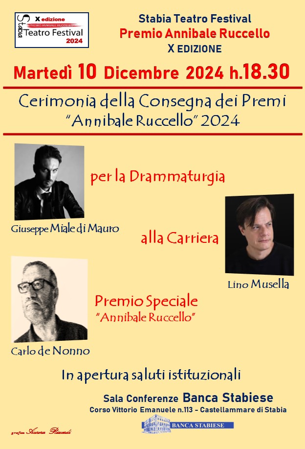 Si svolgerà martedì 10 dicembre 2024, alle ore 18.30, presso la storica Sala Conferenze della Banca Stabiese la Cerimonia della Consegna dei Premi Annibale Ruccello 2024 con cui si chiude la X edizione dello Stabia Teatro Festival che ha visto il susseguirsi, per un mese, di importanti eventi teatrali e letterali nella città di Castellammare di Stabia.