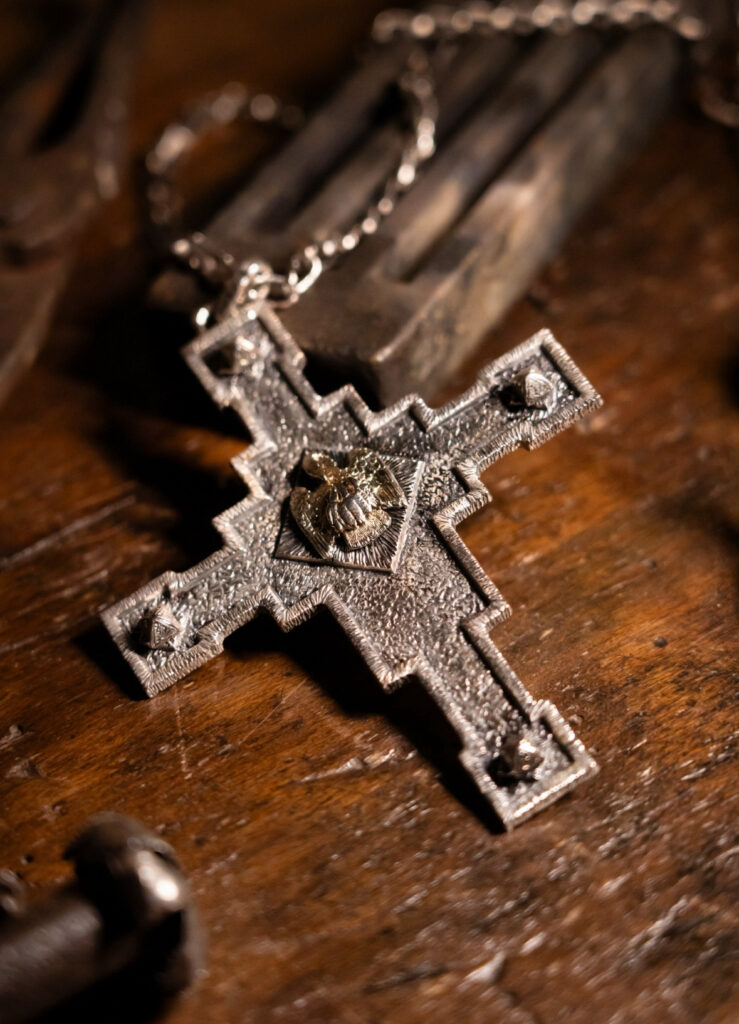 La collaborazione con il cinema, in particolare con Conclave, ha portato la vostra arte su un palcoscenico internazionale. Come è nata questa opportunità e cosa vi ha emozionato di più nel vedere le vostre creazioni sul grande schermo? Tutto è nato grazie a Ilaria Marmugi, costume supervisor del film, che ha coordinato con straordinaria cura ogni dettaglio della realizzazione. La nostra collaborazione con lei è stata naturale, frutto di una stima e di un rapporto costruito nel tempo, soprattutto nella creazione di arte sacra e teologica. Essendo fiorentina, conosce bene il nostro lavoro e ha subito intuito che la nostra bottega fosse la scelta ideale per donare autenticità e valore ai gioielli dei cardinali in Conclave. Ciò che ci ha affascinato di più è stata la possibilità di sperimentare e interpretare le diverse personalità dei cardinali attraverso i dettagli orafi. Ogni personaggio nel film proviene da una parte diversa del mondo e il suo rango, la sua visione della fede e il suo carattere si riflettono nei materiali e nei colori delle croci e degli anelli. I più tradizionalisti indossano gioielli in oro, più imponenti e solenni, mentre i cardinali di spirito più moderno portano creazioni in argento, dalle linee sobrie ed essenziali. Questa varietà è ben visibile nel film, dove, al di là dell’uniformità dell’abito ecclesiastico, ogni croce diventa un elemento distintivo, un simbolo della personalità di chi la porta. Un altro aspetto emozionante è stato realizzare ogni pezzo su misura per gli attori, creando gioielli che non fossero semplici accessori, ma vere e proprie estensioni dei loro personaggi. Ogni croce è stata finemente lavorata sia sul fronte che sul retro, con incisioni e dettagli pensati per essere perfettamente coerenti con il ruolo di chi l’avrebbe indossata. Infine, il momento più gratificante è stato sapere che, terminato il film, ogni attore ha ricevuto in dono la croce realizzata per il proprio personaggio, portando con sé un pezzo unico della nostra arte e della nostra storia.