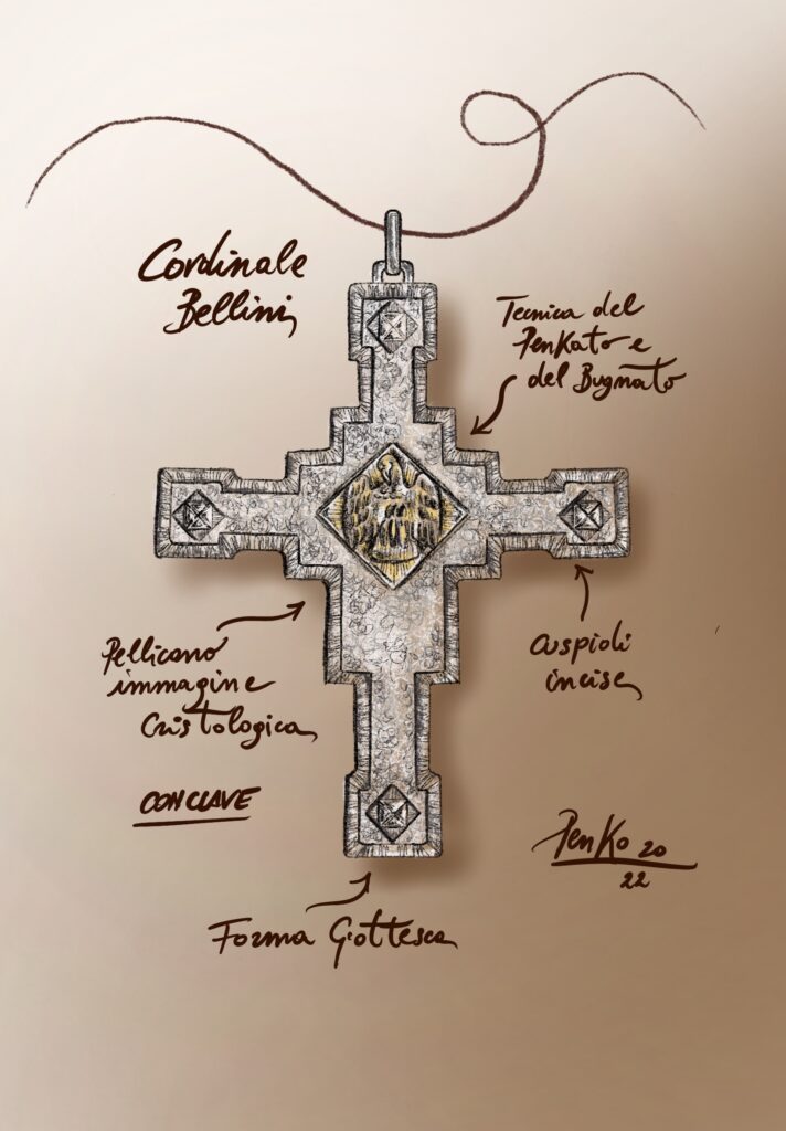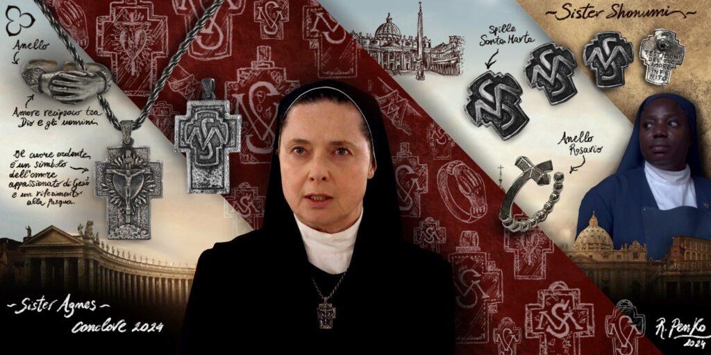 Ogni gioiello realizzato nella vostra bottega racconta una storia e ha un’anima unica. C’è un pezzo in particolare, tra quelli creati per il film, che vi ha colpito per il suo significato o per la complessità della lavorazione? Per complessità e significato, ogni opera ha il suo fascino. Ognuna di essa ha lasciato un’impronta indelebile sul grande schermo. Uno dei pezzi più iconici è senza dubbio la croce del cardinale Bellini, interpretato da Stanley Tucci. Il suo personaggio, figura progressista e vicina alle idee del defunto Papa, porta una croce in argento dalle linee sobrie ed essenziali, ma carica di simbolismo. Al centro, un pellicano che nutre i suoi piccoli lacerandosi il petto: un’antica allegoria cristiana del sacrificio e della dedizione assoluta. Un dettaglio di straordinaria potenza visiva e spirituale, che riflette il tormento interiore del personaggio e la profondità delle sue scelte. Sul retro della croce è incisa una frase significativa, un sigillo del suo cammino e della sua missione che recita: “PIE PELLICANE, JESU DOMINE, ME IMMUNDUM MUNDA TUO SANGUINE”. Un’altra creazione di grande impatto è la croce indossata da Isabella Rossellini che interpreta Sorella Agnes. La sua croce è pensata per esprimere il peso e la responsabilità del suo ruolo. Imponente e strutturata, è stata lavorata con un’estrema attenzione ai dettagli per trasmettere la forza e la determinazione che il personaggio incarna. Ogni incisione, ogni scelta estetica racconta il fardello che porta sulle spalle, rendendo il gioiello non solo un ornamento, ma un’icona emblematica. La croce del cardinale Goffredo Tedesco, interpretato da Sergio Castellitto, invece, rappresenta invece la visione più tradizionalista del potere ecclesiastico. Proveniente da Venezia, il personaggio porta con sé un legame profondo con la sua terra, riflesso nell’oro e nelle pietre preziose che impreziosiscono la sua croce. Un’opera che richiama la grande tradizione orafa veneziana, con dettagli raffinati che esprimono il rigore e l’adesione alle tradizioni della Chiesa. Tengo a ribadire che ogni croce e ogni gioiello creato per il film è stato concepito non solo come un elemento scenico, ma come parte integrante dell’identità dei personaggi. Sono dettagli che parlano, che svelano le loro ambizioni, le loro convinzioni, i loro conflitti interiori. Ed è proprio questo il fascino più grande del nostro lavoro: trasformare il metallo in racconto, l’arte in simbolo, la materia in emozione.