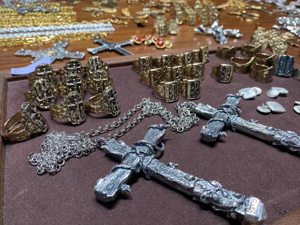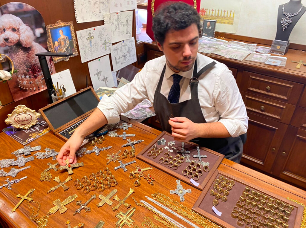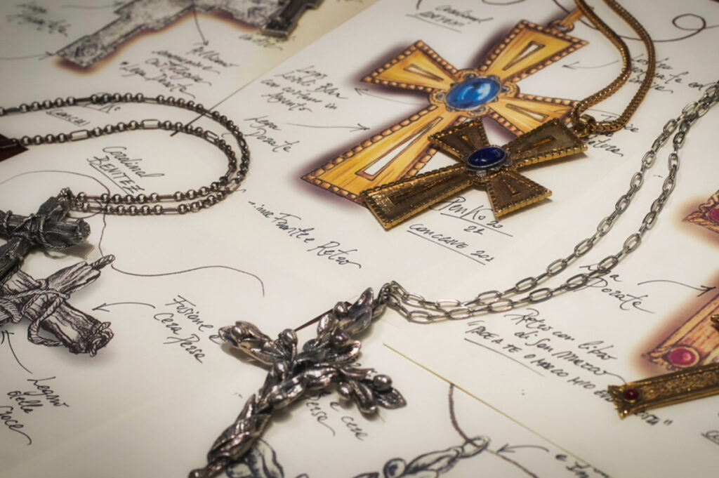 Più di 530 pezzi unici – croci cardinalizie, anelli, gemelli – tutti realizzati con la maestria delle antiche tecniche: fusione a cera persa, traforo, incisione a bulino. Un lavoro che non si è limitato all’estetica, ma ha reso ogni gioiello parte integrante della storia, specchio dell’anima dei personaggi.
