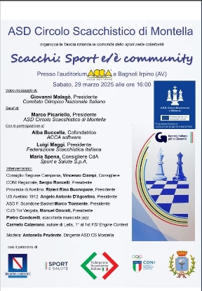 Parliamo del gioco degli scacchi da sempre considerato un modo naturale ed efficace per sviluppare attitudini e capacita’ individuali e acquisire conoscenze ed esperienze necessarie per adattarsi all’ambiente. Gli scacchi possono sembrare solo un gioco ma affondano le loro radici in tempi molto antichi perchè offrono la possibilità di sviluppare l’intelletto umano. L’Irpinia si puo’ ritenere motivo di orgoglio per l’intera comunita’ scacchistica locale per l’effetto piu’ sorprendente che sta registrando con questo nobile e antico gioco da un po’ di anni a questa parte, tanto che il campionato italiano a Squadre 2025, Serie C, ha visto l’Irpinia tra le migliori squadre del girone, ottenendo un primo posto ex equo, permettendo alla compagine irpina di partecipare per la prossima stagione all’ambita serie B di carattere interregionale, L’evento a cui ha presenziato anche la Scandone Avellino con il Presidente Marco Trasente, e’ stato patrocinato dalla Regione Campania, da Sport e Salute S.P.A, dalla Federazione Scacchistica italiana, dal CONI Campania, dal Comune di Bagnoli Irpino e dal Comune di Montella. Dopo il video messaggio di Giovanni Malagó, Presidente Comitato Olimpico Nazionale Italiano e il saluto di Marco Picariello Presidente ASD Circolo Scacchistico di Montella che ha introdotto come validi relatori la dott.ssa Alba Boccella cofondatrice ACCA software insieme al marito dott. Guido Cianciulli, Luigi Maggi Presidente Federazione Scacchistica Italiana, Maria Spena Consigliere CdA Sport e Salute SpA che hanno evidenziato le qualità dello sport degli scacchi in tutte le sue forme. Nel corso dell’incontro sono stati invitati l’On Vincenzo Ciampi, Sergio Roncelli Presidente CONI Regionale sostituito da Francesco Sessa, Rizieri Buonopane Presidente Provincia Avellino, Angelo Antonio D’Agostino Presidente Us Avellino 1912, Marco Trasente Presidente ASD F. Scandone Basket, Manuel Onorati Presidente CUS Tor Vergata, Pietro Condorelli scacchista musicista jazz, Carmelo Calzerano autore di Leila, 1° al 1st FSI Engine Contest. Ha moderato l’incontro Antonella Prudente, Dirigente ASD CS Montella, convinta sostenitrice del valore educativo che ha questo sport come collante sociale. Un’occasione di confronto tra atleti, istituzioni e professionisti del settore sportivo per riflettere sul valore dello sport e per dare una nuova visione del territorio non solo ambientale ma anche sociale, inclusiva e etica. E’ importante approfondire la conoscenza degli scacchi e anche incoraggiare l’espressione di una volontà di riscatto sociale come strumento educativo, pedagogico anche in virtu’ di una progettazione di attività trasversali in modo che il territorio assuma un aspetto piú efficiente e piú propositivo per una nuova e auspicabile visione del territorio.