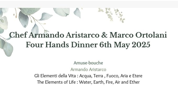 Il mondo, l’internazionalità, si affacciano nel menù del 6 maggio e lo fanno gradualmente, quasi in punta di piedi, con un solletico leggero di spezie o di accostamenti ma senza intaccare minimamente la volontà di entrambi gli chef di esaltare il patrimonio gastronomico italiano, di preservarlo da ogni forzatura artificiosa, da ogni interpretazione che sconfina nello stravolgimento e nell’irriconoscibilità. Nessuna costruzione arzigogolata: la tradizione è già rivoluzione. Ed è questo il segreto della cena che attende gli ospiti il 6 maggio.