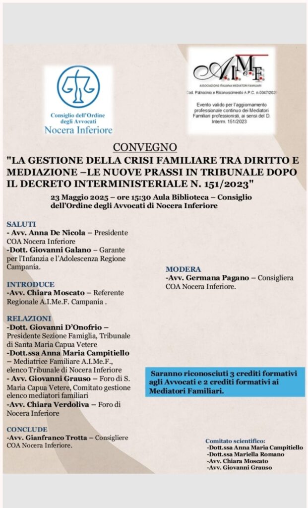 MediaVox invita i suoi lettori, in particolare Avvocati e Professionisti del Settore, a partecipare all’importante Convegno formativo organizzato dall’A.I.Me.F. (Associazione italiana Mediatori familiari), in collaborazione con il COA di Nocera Inferiore, presieduto dall’Avv. Anna De Nicola.
