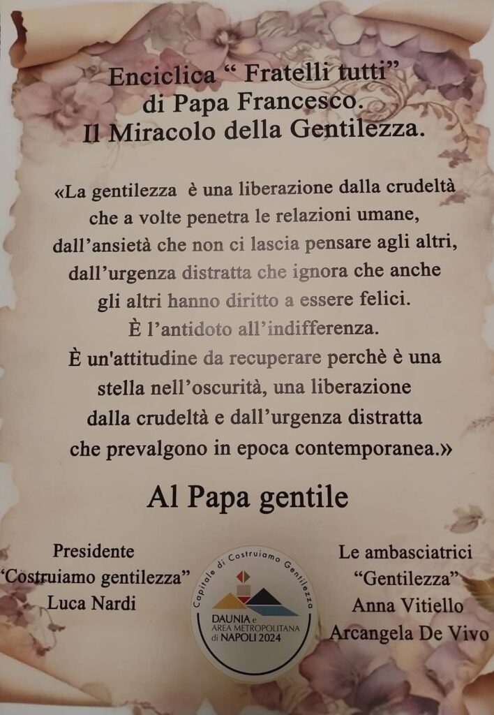 Momento di forte commozione è stato il ricordo della pergamena di “Papa Gentile” consegnata simbolicamente al compianto Papa Francesco, che con la sua umanità ha rappresentato un faro nel mondo contemporaneo. Proprio da questa ispirazione, la Dott.ssa Monda e la Dott.ssa Vitiello hanno annunciato la nascita della prima edizione del Premio “Papa Gentile”, dedicato a un pontefice (presente o futuro) che sappia incarnare i valori della gentilezza, dell’umanità e del dialogo.