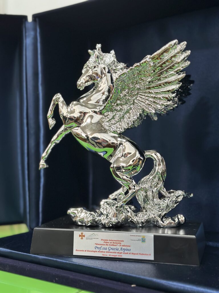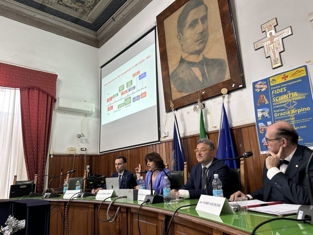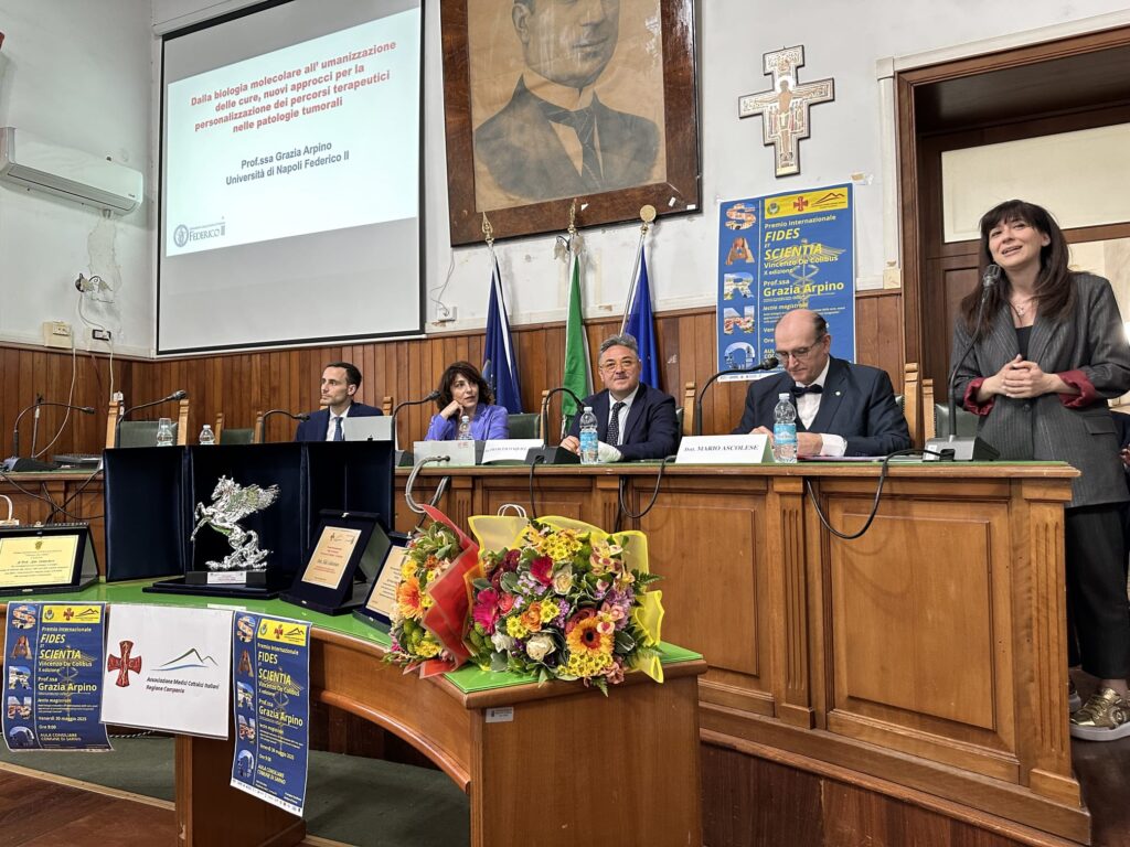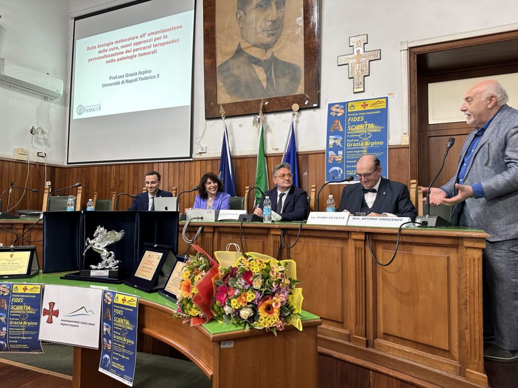 Quest’anno, il premio è stato conferito alla Professoressa Grazia Arpino, stimata docente di oncologia medica presso il Dipartimento di Medicina Clinica e Chirurgia dell’Università degli Studi di Napoli “Federico II”. La Professoressa Arpino ha tenuto una lectio magistralis dal titolo “Dalla biologia molecolare all’umanizzazione delle cure: nuovi approcci per la personalizzazione dei percorsi terapeutici nelle patologie tumorali”. Questo tema sottolinea l’importanza di un approccio olistico alla medicina, che integri le più avanzate conoscenze scientifiche con la sensibilità e l’attenzione al paziente come persona. La Professoressa Arpino vanta un curriculum di alto profilo, con un focus sulla ricerca clinica sui tumori della mammella. È stata Principal Investigator di numerosi studi clinici multicentrici nazionali e internazionali e ha pubblicato oltre 200 articoli scientifici su riviste internazionali. La sua ricerca si concentra sull’identificazione di fattori prognostici e predittivi nel carcinoma mammario, con l’obiettivo di sviluppare nuovi approcci terapeutici personalizzati, volti a migliorare l’efficacia delle cure e la qualità della vita dei pazienti. Il suo impegno in progetti di ricerca traslazionale evidenzia la sua capacità di trasferire le scoperte di laboratorio nella pratica clinica, a beneficio diretto dei malati.