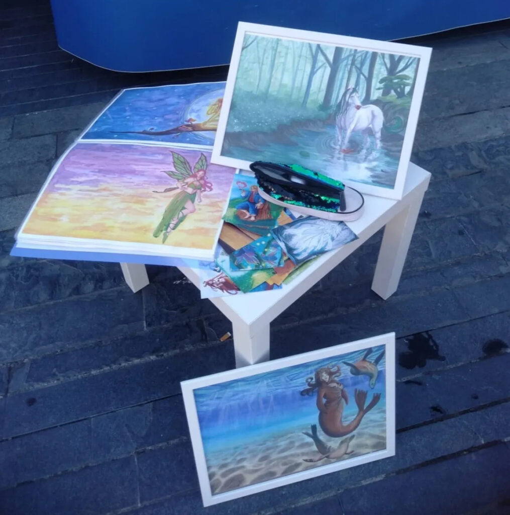 Ci racconta l’estemporanea di pittura che ha realizzato al Village di Cartoons in the Bay? Sono andata, probabilmente, controcorrente, scegliendo di utilizzare prevalentemente gli acquerelli, uno strumento poco comune nelle estemporanee. Ho voluto però sperimentare, impiegando una tipologia particolare di acquerelli dai pigmenti metallizzati e luccicanti. Ho poi rifinito l’opera con pastelli e pennarelli, per aggiungere profondità e vibrazioni diverse. Il mio intento era quello di realizzare un’opera onirica e suggestiva, capace di evocare l’atmosfera del Festival e di dialogare con la sua energia creativa.