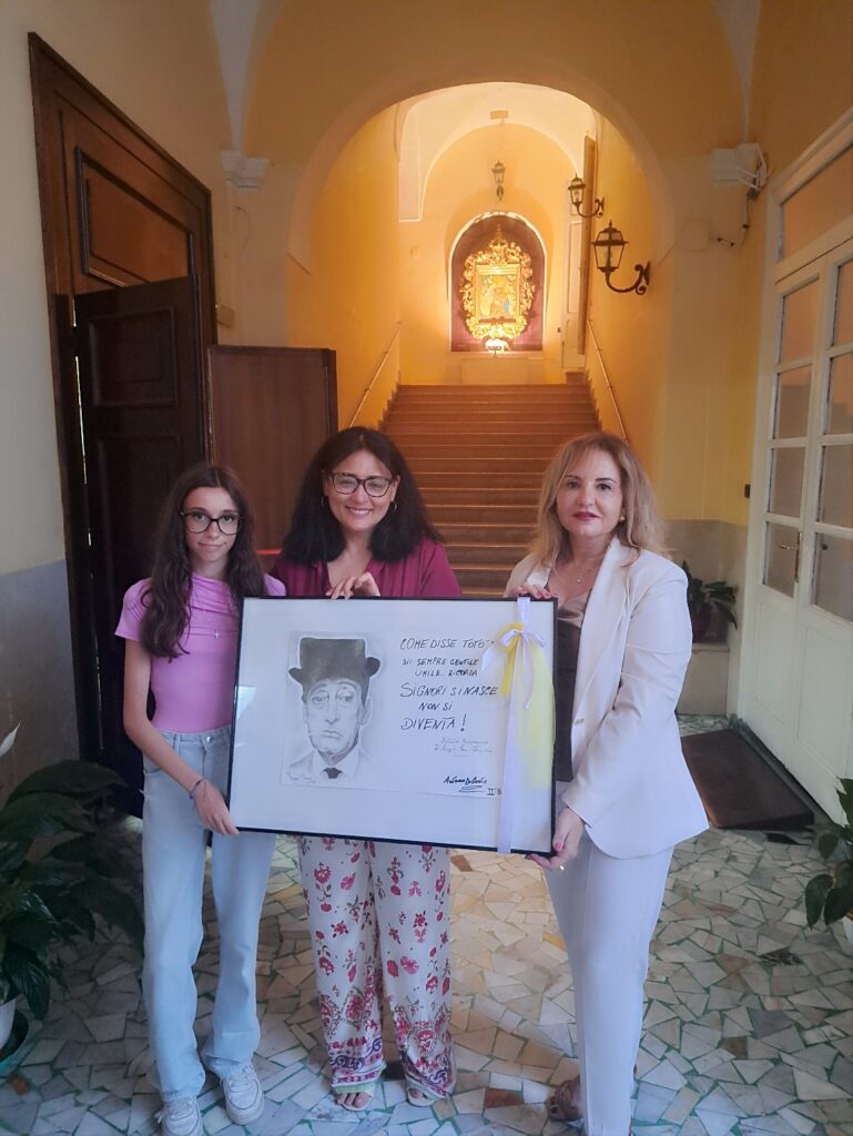 Momento particolarmente significativo è stato il dono di una mattonella raffigurante la “Maronna d’Accompagni”, accompagnato dal racconto di un gesto familiare pieno d’amore: il bacio sulla fronte e la benedizione con quelle parole che univano generazioni. A coronare l’omaggio, una giovane studentessa di 12 anni dell’Istituto Comprensivo D’Anjou ha donato un ritratto di Totò, un’opera carica di talento e significato.