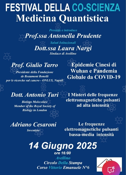 Si e’ svolto sabato 14 giugno presso il Circolo della Stampa di Avellino il Festival della Co-Scienza organizzato su iniziativa della signora Sabina Nappa con l’obiettivo di portare ad Avellino un confronto culturale di conoscenza e consapevolezza su un argomento delicato e attuale di tutte le leggi fisiche a cui la materia biologica risponde per il nostro benessere psico-fisico. Ha introdotto i lavori la prof.ssa Antonella Prudente che ha cercato di ricreare una relazione interpersonale fatta di incontro, di dialogo e di condivisione, ponendo l’accento su una visione piu’ ampia che riguarda il paziente che affronta la malattia. L’evento ci ha offerto una panoramica sui recenti sviluppi della Medicina Quantistica, scienza molto avanzata che ci fornisce gli strumenti adeguati per lo studio di tutti gli aspetti del comportamento del genere umano. La Medicina Quantistica “ribadisco il concetto”, non cura le malattie nel senso tradizionale del termine ma mira a riequilibrare i campi elettromagnetici e le comunicazioni cellulari dell’organismo attraverso l’utilizzo delle frequenze specifiche esplorando il misterioso mondo delle frequenze elettromagnetiche e il loro impatto sulla salute umana. Al dibattito sono intervenuti personalita’ di alto livello che provengono da esperienze professionali ed umane molto diverse tra loro i quali ci hanno consentito di approfondire la tematica in maniera interessante offrendo tanti spunti di analisi differenti. Il tema e’ stato affrontato in un approccio interdisciplinare con il Prof. Giulio Tarro che ci ha parlato delle epidemie di Wuhan e pandemia globale da covid-19”. Il dott. Antonio Turi ha relazionato sui misteri delle frequenze elettromagnetiche pulsanti ad alta densita’ infine Adriano Cesaroni inventore ha illustrato le frequenze elettromagnetiche pulsanti a bassa -media intensita’. In conclusione quello che si auspica attraverso questi incontri e’ che si affacci la speranza di un efficiente prevenzione nei confronti dei rischi delle persone fragili.
