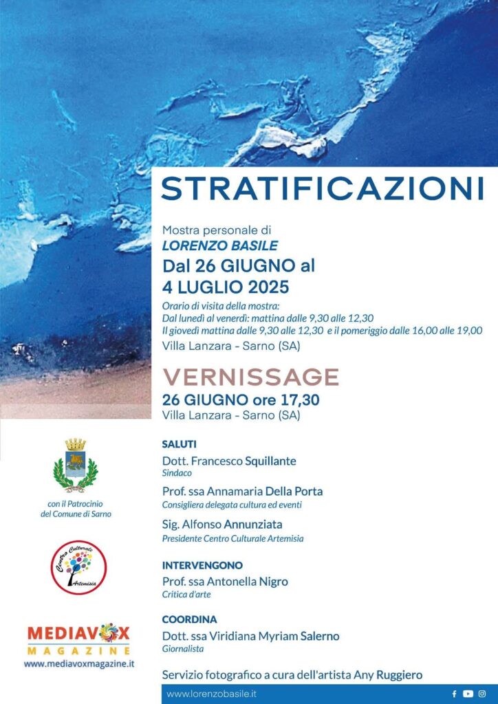 Stratificazioni è il titolo della mostra che il maestro Lorenzo Basile ha allestito a Sarno (SA), nella monumentale Villa Del Balzo nel periodo 26 giugno / 4 luglio 2025.