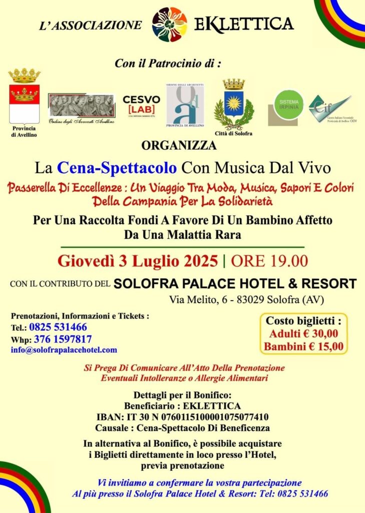 Sarà una serata che lascerà il segno, un inno alla bellezza, alla solidarietà e alle radici profonde di una terra generosa. Il 3 luglio, nella raffinata cornice del Solofra Palace Hotel & Resort, andrà in scena “Passerella di Eccellenze: Un Viaggio tra Moda, Musica, Sapori e Colori della Campania per la Solidarietà”, una Cena-Spettacolo con musica dal vivo che si preannuncia come uno degli appuntamenti più suggestivi dell’estate irpina.