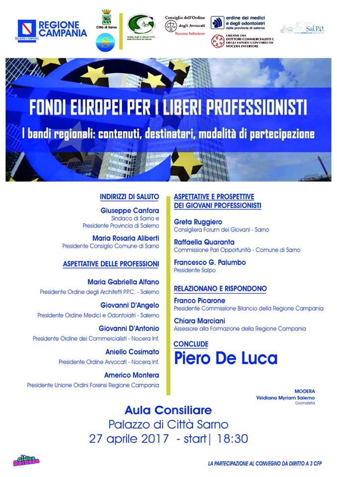 Grande successo di pubblico per l’interessante Convegno formativo tenutosi presso l’Aula consiliare del Comune di Sarno, fortemente voluto dall’Amministrazione del Sindaco Giuseppe Canfora ed, in particolare, dalla Presidenza del Consiglio retta dall’Avv. Maria Rosaria Aliberti.In base alle Raccomandazioni europee, i liberi professionisti sono stati assimilati alle imprese; ciò consente di riconoscere i professionisti come beneficiari dei Fondi strutturali stanziati dall’Europa. Tali Fondi sono gestiti dalla Commissione europea, dallo Stato e dalle Regioni.