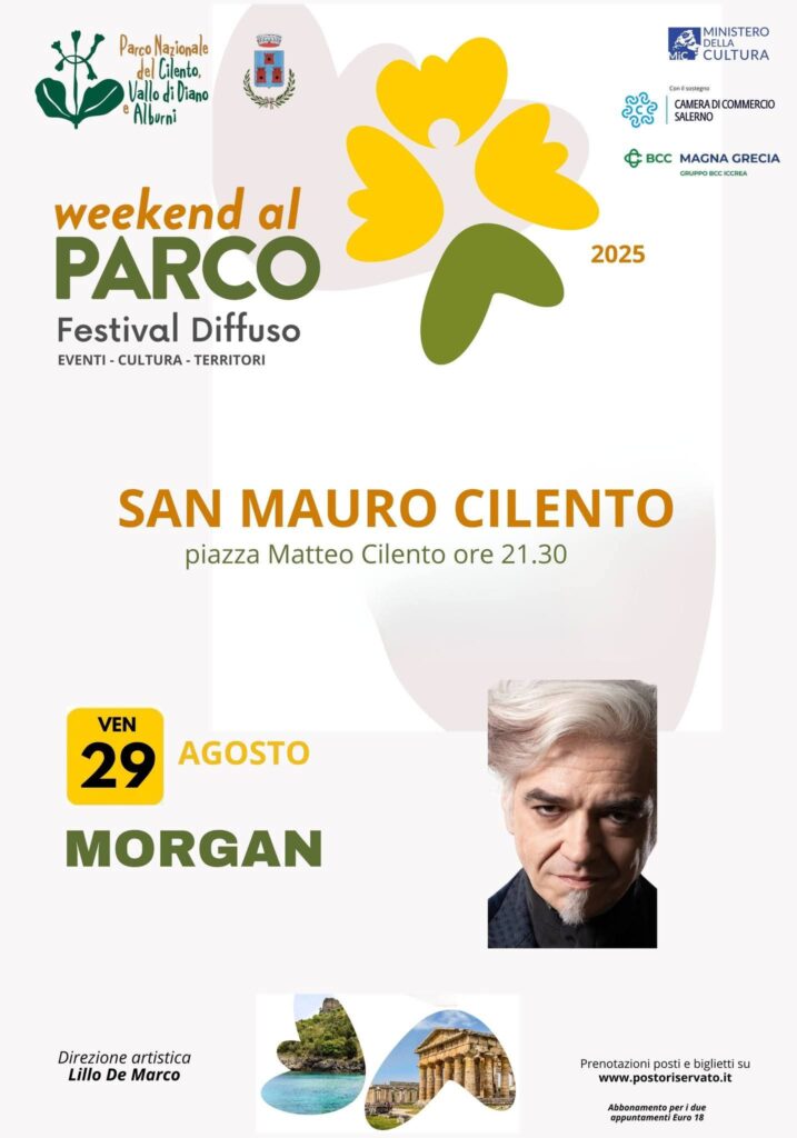 Il calendario si apre con Morgan, atteso venerdì 29 agosto 2025 alle ore 21.30 in piazza Matteo Cilento a San Mauro Cilento. Personalità poliedrica della scena musicale italiana, Morgan è cantautore, musicista e produttore capace di fondere linguaggi sonori e sperimentazione, regalando al pubblico performance intense e originali.