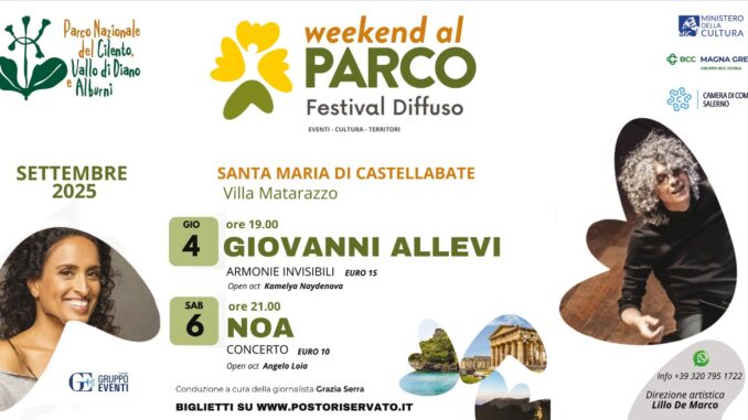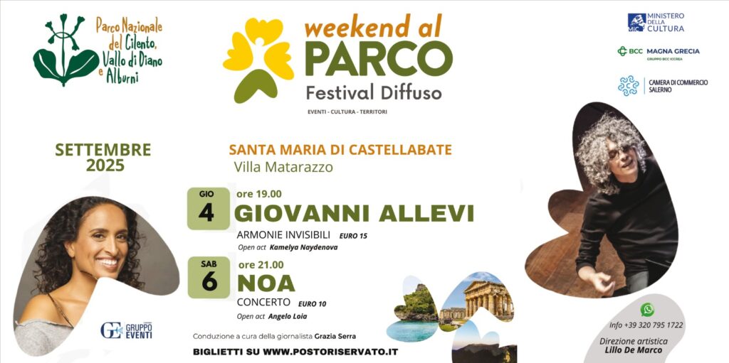 Il Parco Nazionale del Cilento, Vallo di Diano e Alburni diventa palcoscenico di emozioni, musica e cultura con “Weekend al Parco – Festival Diffuso”, una rassegna che porta artisti di fama internazionale nei borghi e nelle location più suggestive del territorio; la direzione artistica è di Lillo De Marco, con il sostegno del Ministero della Cultura, della Camera di Commercio di Salerno e di BCC Magna Grecia.