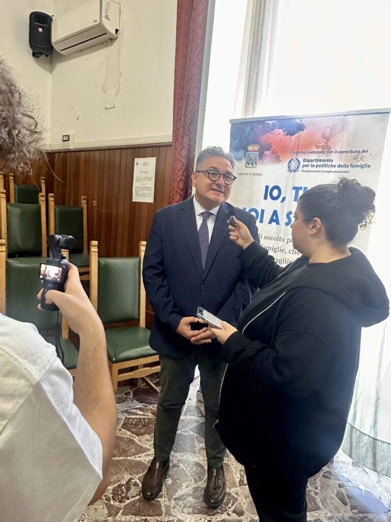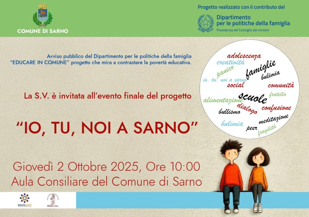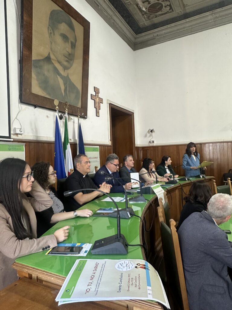 Sarno (SA), 02.10.2025 | Con grande partecipazione si è tenuto l’evento conclusivo del progetto “Io, Tu, Noi a Sarno”, un’iniziativa che ha saputo unire innovazione e comunità nella promozione del benessere adolescenziale e familiare. La giornata si è aperta con la parte istituzionale nell’Aula consiliare del Comune di Sarno ed è proseguita con un momento più interattivo nel suggestivo Chiostro della Chiesa di San Francesco, nel cuore di Piazza IV Novembre.