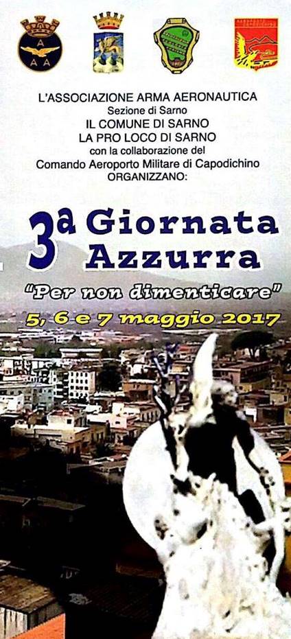 Comando Aeroporto Militare di Capodichino e del 9° STORMO di Grazzanise, in occasione del 19° Anniversario dei tragici eventi che colpirono la Città di Sarno, organizzano, nei giorni 5, 6 e 7 maggio 2017, la “III GIORNATA AZZURRA PER NON DIMENTICARE”.